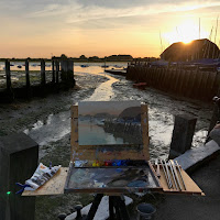 Husband Nick and I went down to Bosham and this view grabbed me as the sun was dancing on the water and warm apricots in the sky. I knew it would be a hard one because it was changing so quickly. I painted some structure of the harbour side and building first and then whacked in the light. Keeping in mind less is more and not putting in too much detail letting the eye do the work.