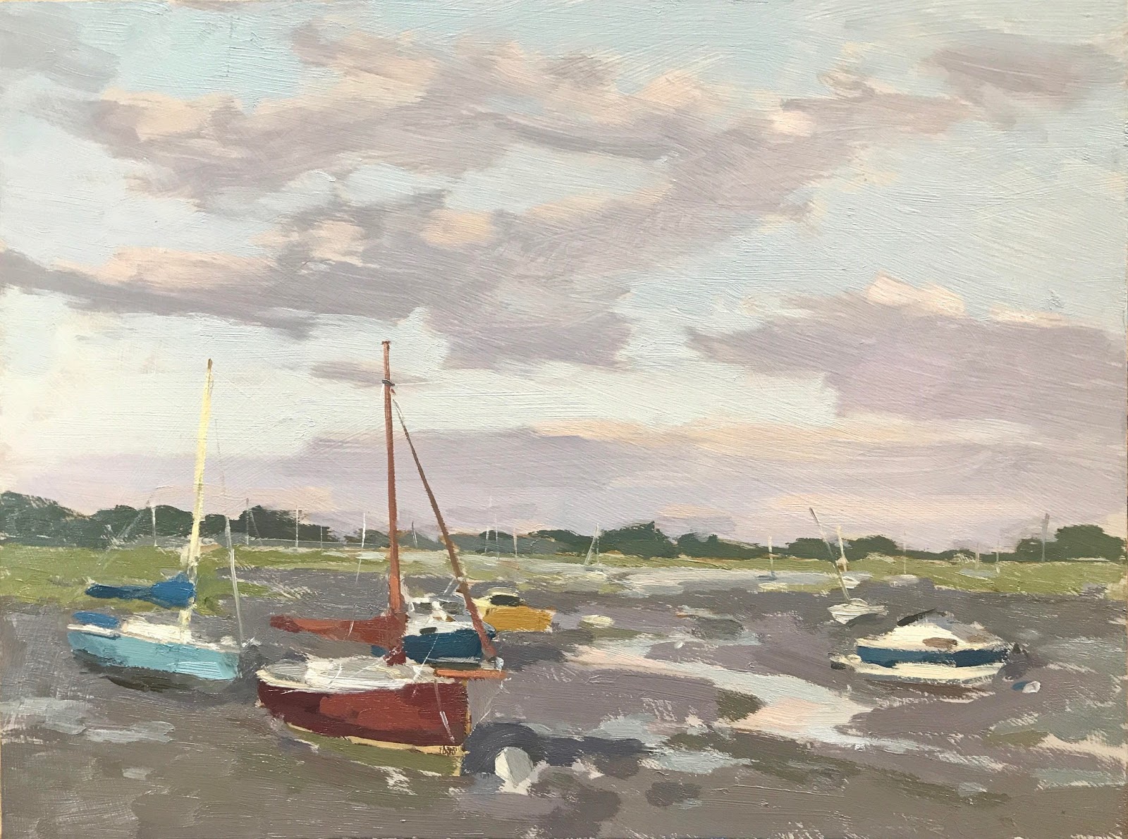 I tinted the mud and distant green in the violet sky cloud mix which gives a harmonious feel to the colours. Careful not to overpaint or fuss the boats but leave them ‘imperfect’ looking. This helps make them sit in the panting and be connected with the surroundings.