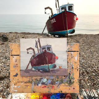 I eased myself in when we arrived with this painting of a typical fishing boat in Beer. The light was unsual, still yellow sky and milky green water. I enjoyed painting the silhuetted shape against the light background. Tried to keep the brush work fresh and not overwork it.