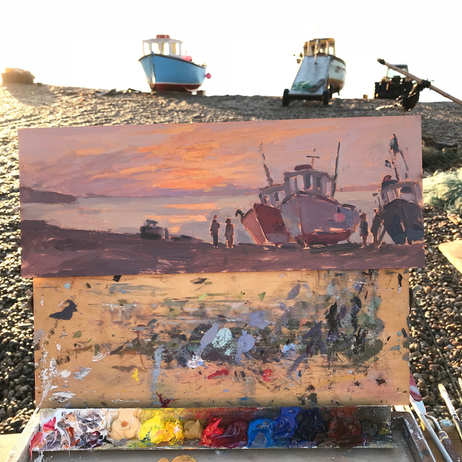It needed fast painting as there was little time between the sun coming up and the boats disappearing over the edge of shingle. They are pushed by the tractor down the 5 meter drop into the sea, and when they ome back they are winched the steep slope back onto the brow of the beach.