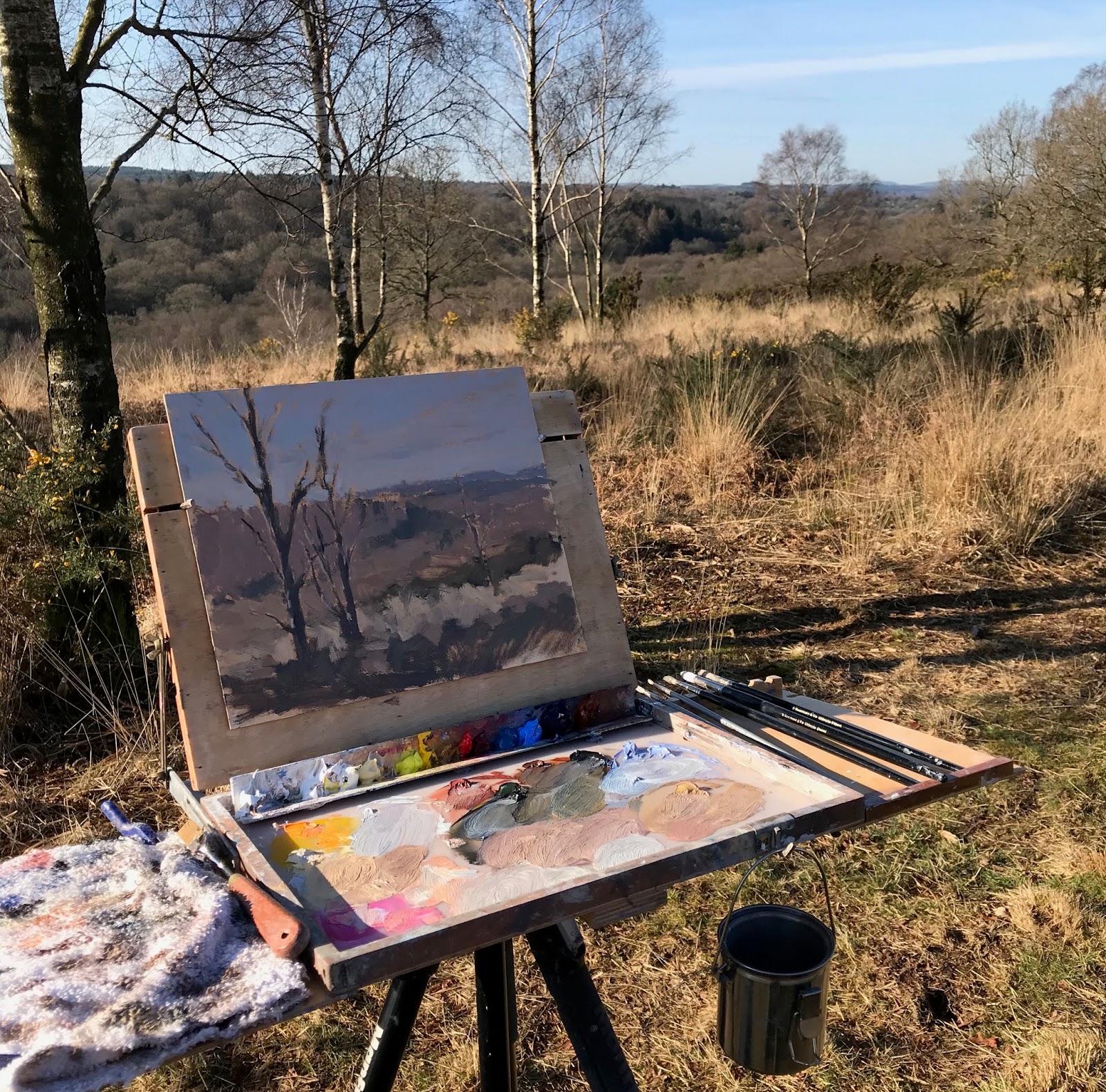 I decided this was going to be a more tonal painting less colour more about tonal shapes and brush marks. Leaving some of the board colour showing gives a sense of unity. The foreground trees are on the golden line – where it’s the most pleasing to the eye – about a third in.