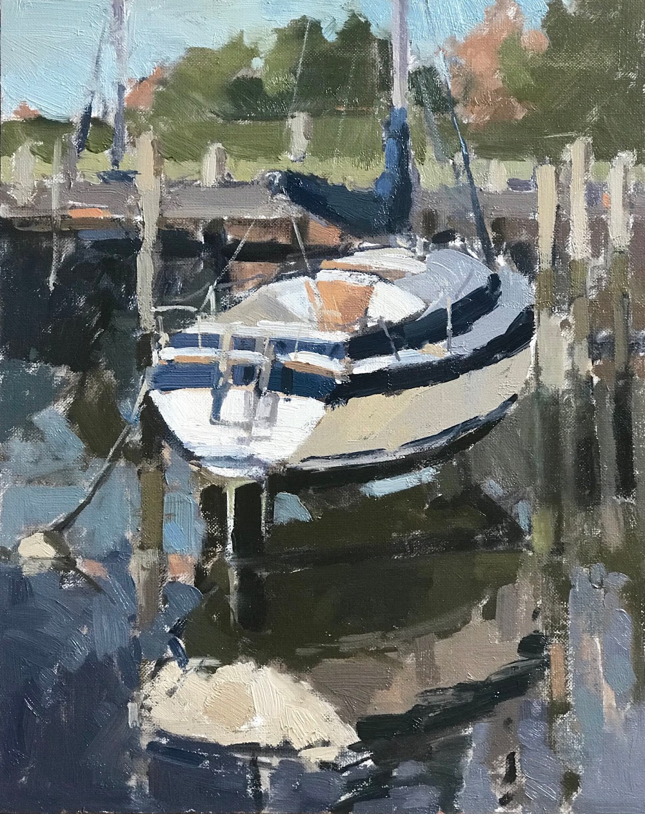 The side of the boat (hull) in shadow getting the tonal value not too dark and still warm as well, The top of the boat was quite blue – in shadow but also reflecting the sky. I’m pleased with how it turned out.