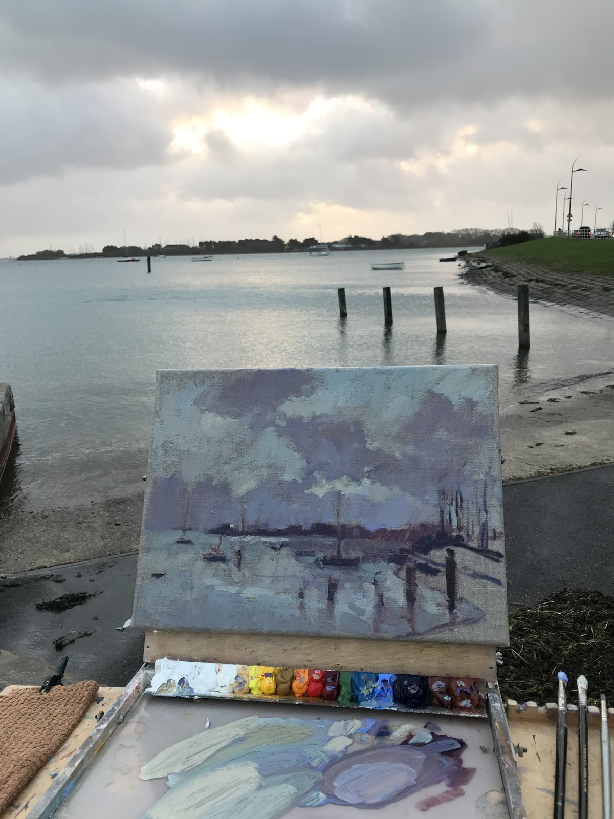 Decided to include the cars on Hayling Island bridge to help the composition and I used quite thin paint in place to let the linen coloured canvas show through.