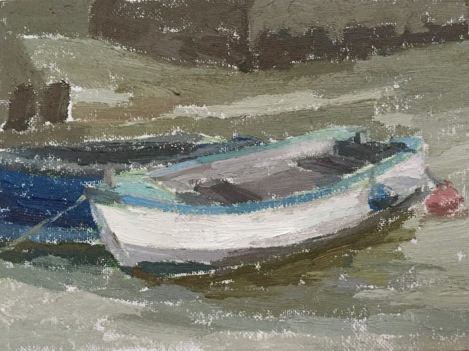 I tried standing with my pochard but my head was above the sea wall and got the brunt of weather so I tucked myself down and perched on a stone. I should have checked the tide times as the sea went out quicker than I was painting it! I quickly put the sea in around the boat while it was still there. The flat light was difficult to pick out the tones.