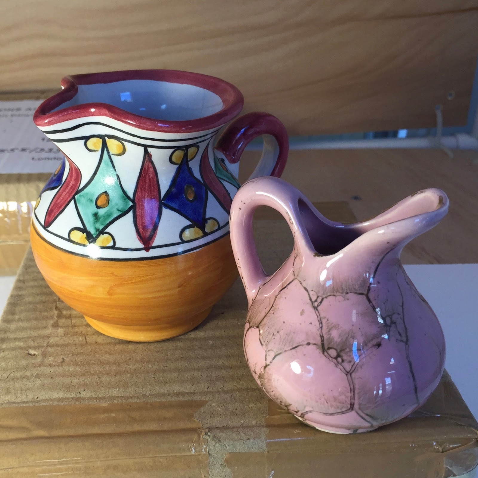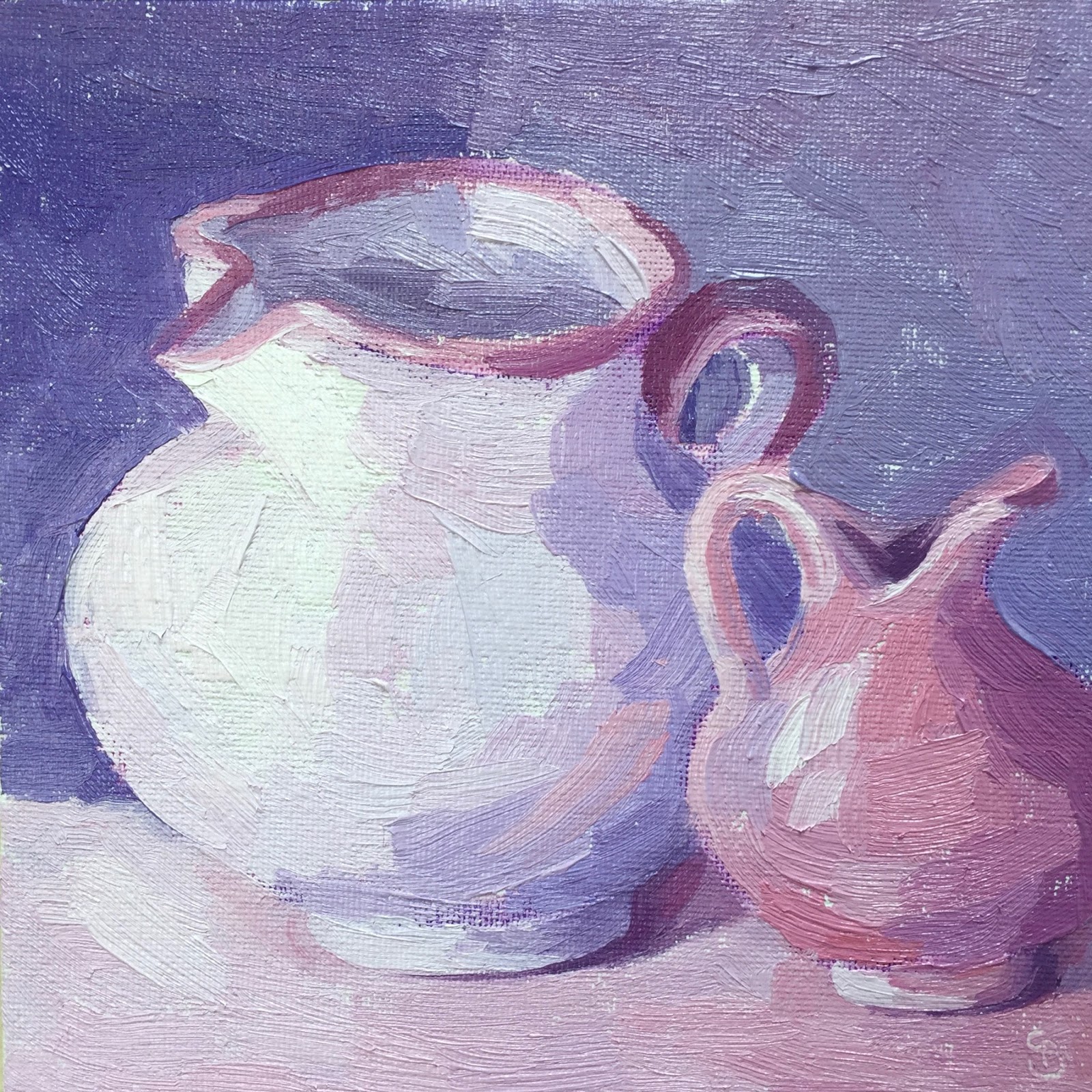 I finished my colour studies this morning and wanted to use some of the lovely pinks and violets I had mixed. So this is the result of it! I didn’t have many pink pots or jugs in my supply so adapted what I had, see photo below to what they really looked like!