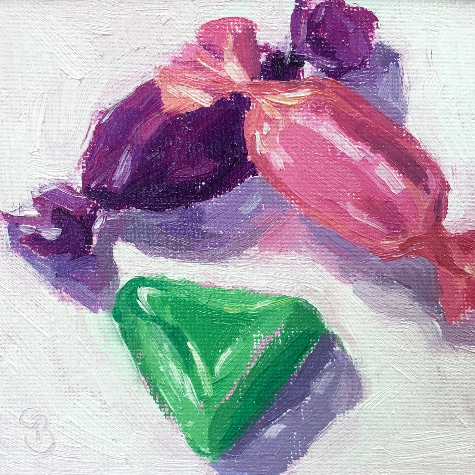 These chocolates were surpringsly tricky to paint. The colours are quite intense, I used my artifical colours like Pathalo Blue & Green and Magenta. Lots of reflective surfaces with highlights and shine. Many colours are in the shadows too. I did paint the background a pale pink but change it as the chocs disappeared, the whiter background makes them pop out.