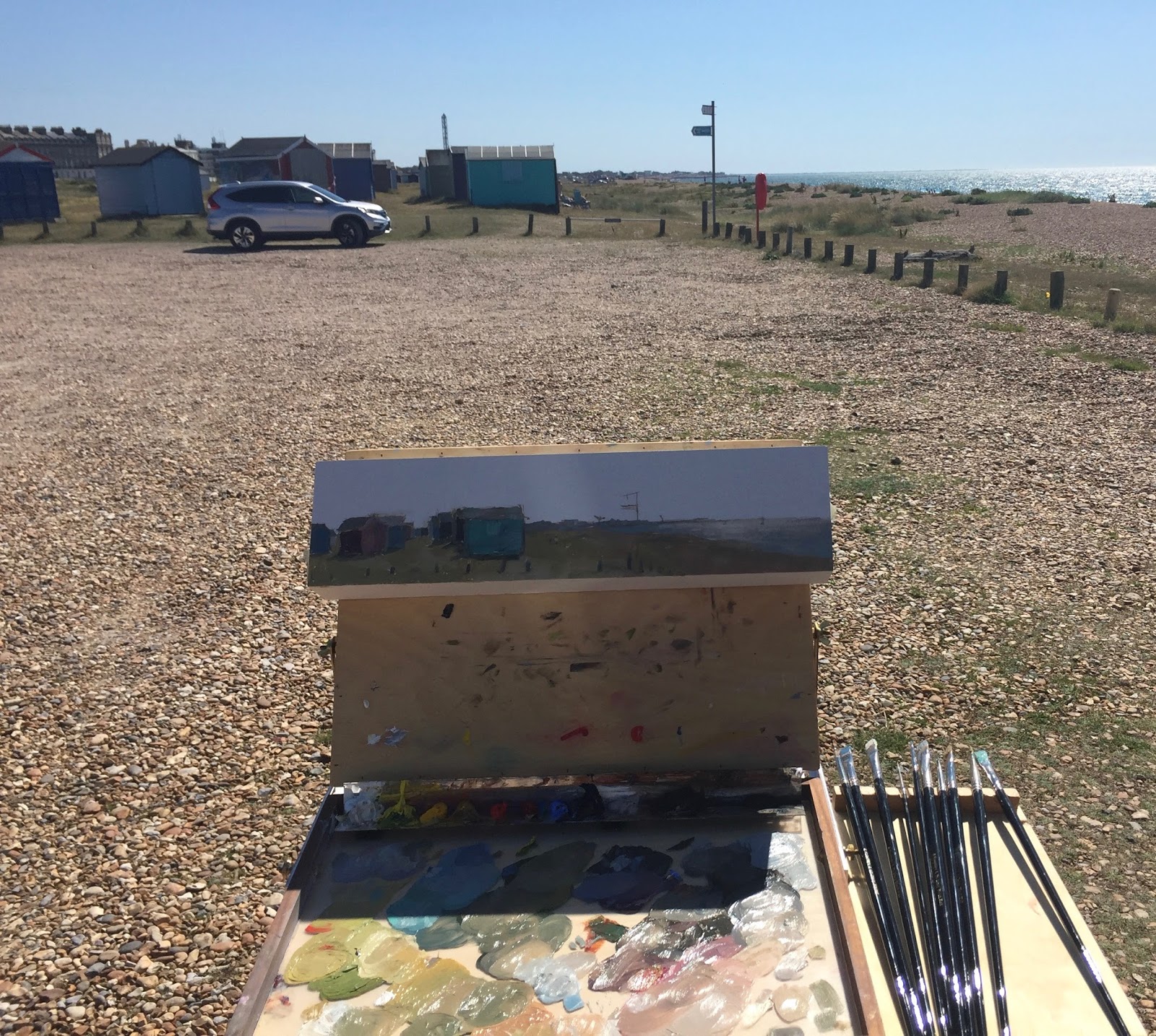 A hot day standing directly looking into the sun but worth it! Really enjoyed painting these beach huts, and on the panormic format. A lot of the beach huts were in shadow so I had to hold back with using saturated colours but still managed to get some turquoise and pinks in 🙂
