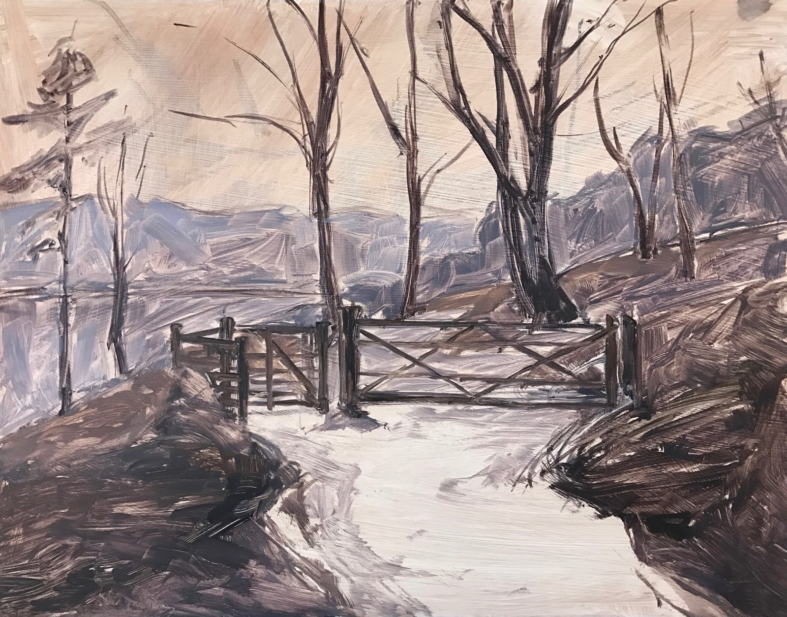I kept some of the thined painting but modulated the edges of the path with opaque lighter tones. The sky I put a yellow tinge which there wasn’t much of on the day but seams to work well with overcast snow days.