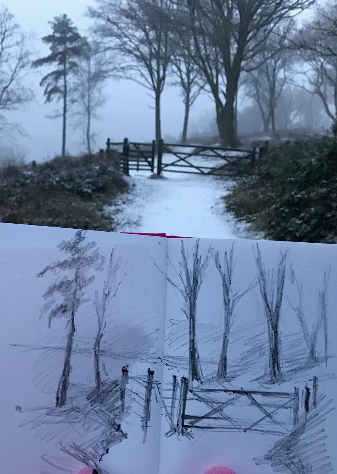 I did a quick sketch (see below) when we had a dusting of snow a couple of weeks ago. I liked the limited colours and that you could see the Punch Bowl sweeping around in the distance – when the mist cleared a little!
