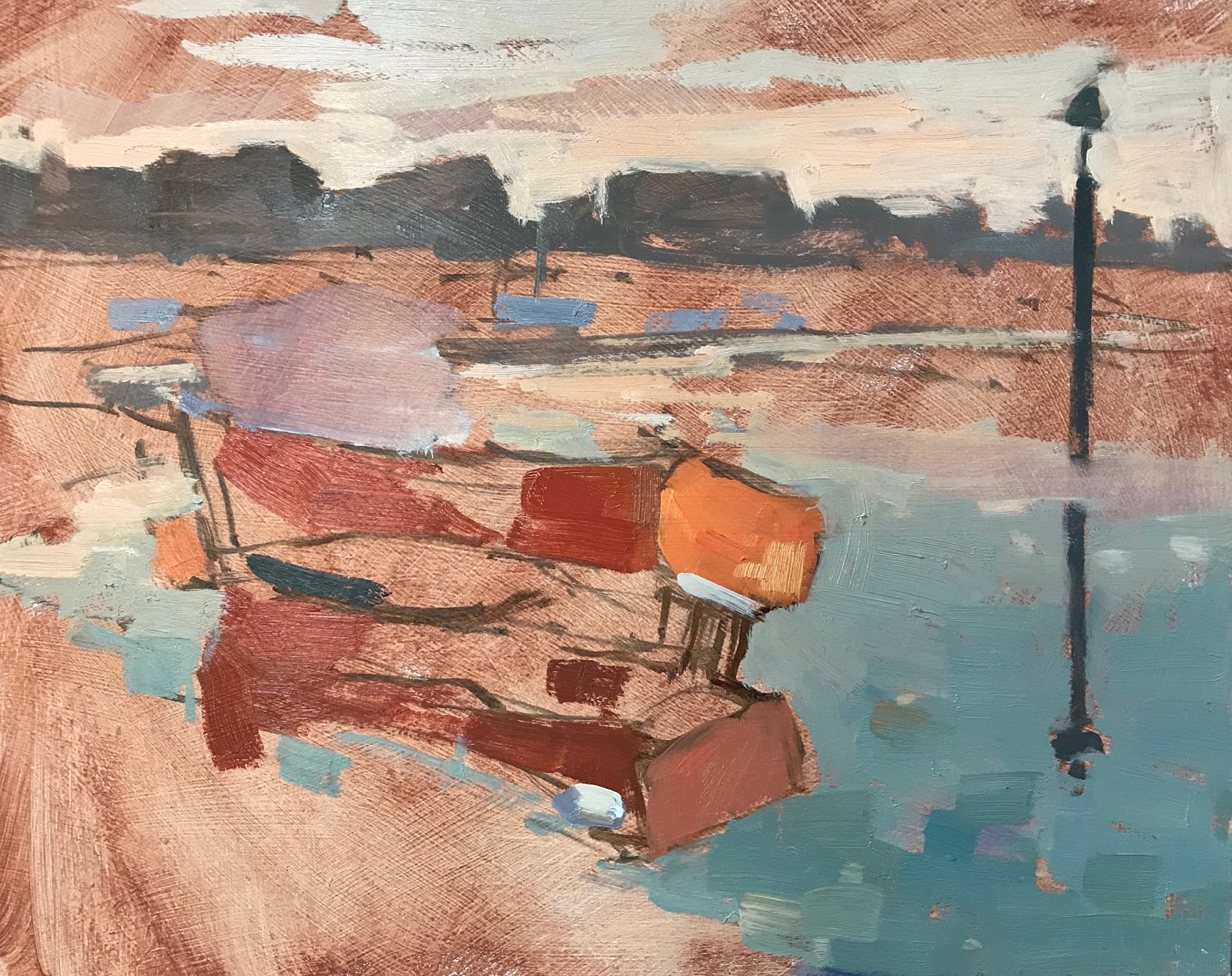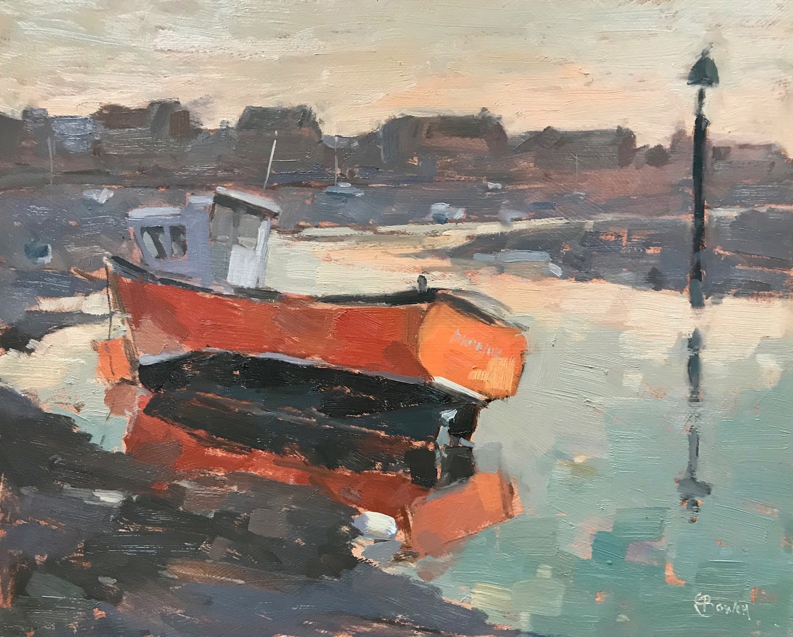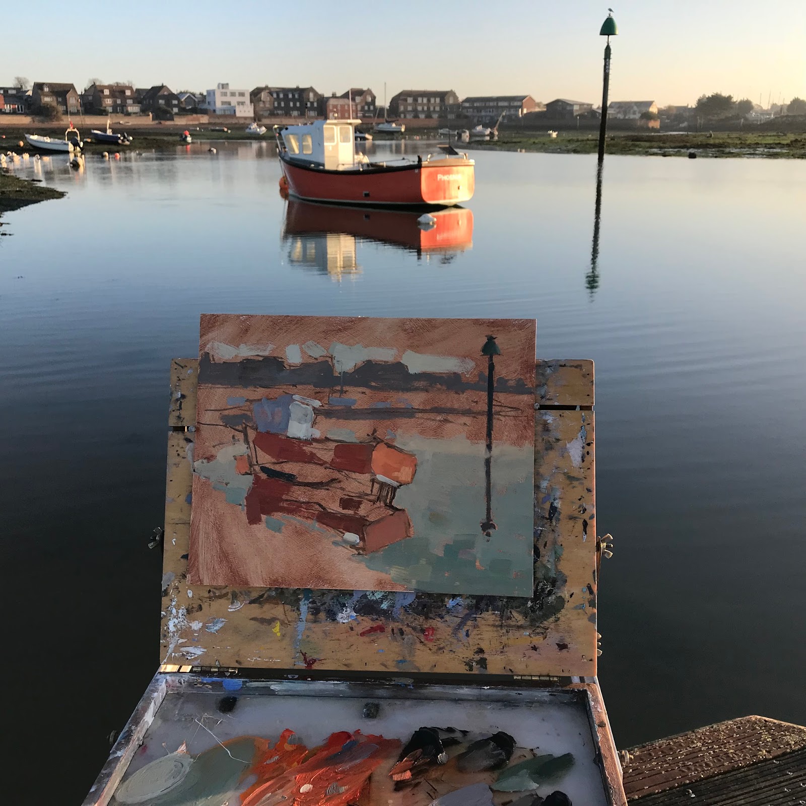 This scene didn’t look that inspiring when I started the painting but knew it would get better as the sun rose. I liked the jaunty angle of the boat and part reflection obscured by the mud.