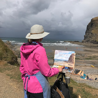 A large imposing cliff the locals call Sleeping Dragon. A great paintable subject…with low tide and the water on the sand reflecting the cliff and sky. People to give scale and interest plus the colourful life guard flags. The sky I’d taken time to put in the sweepy clouds and then some fluffy dark clouds came over the top so I took a risk and painted fluffies over the top, I’m pleased with how it turned out.