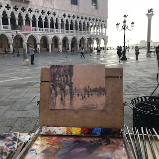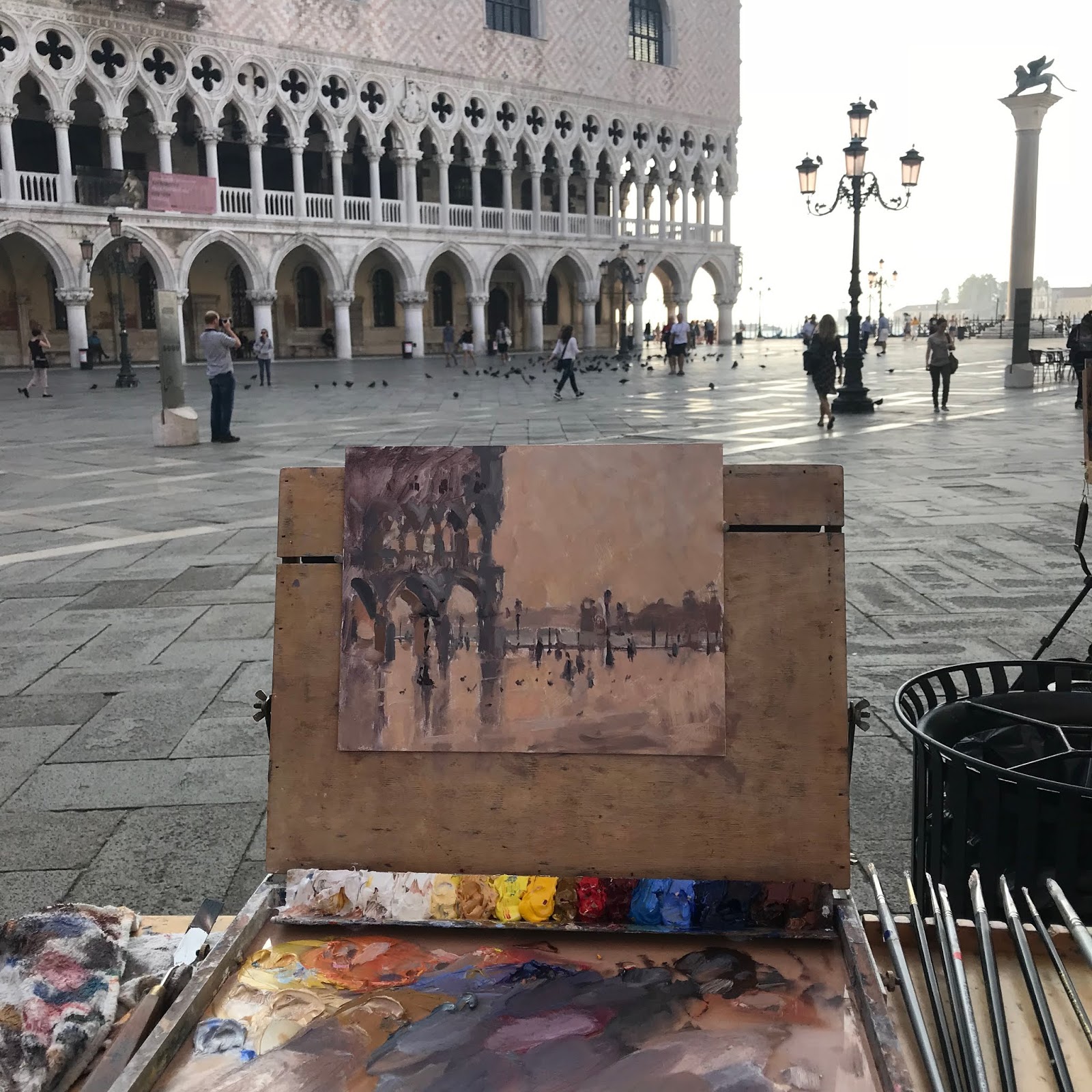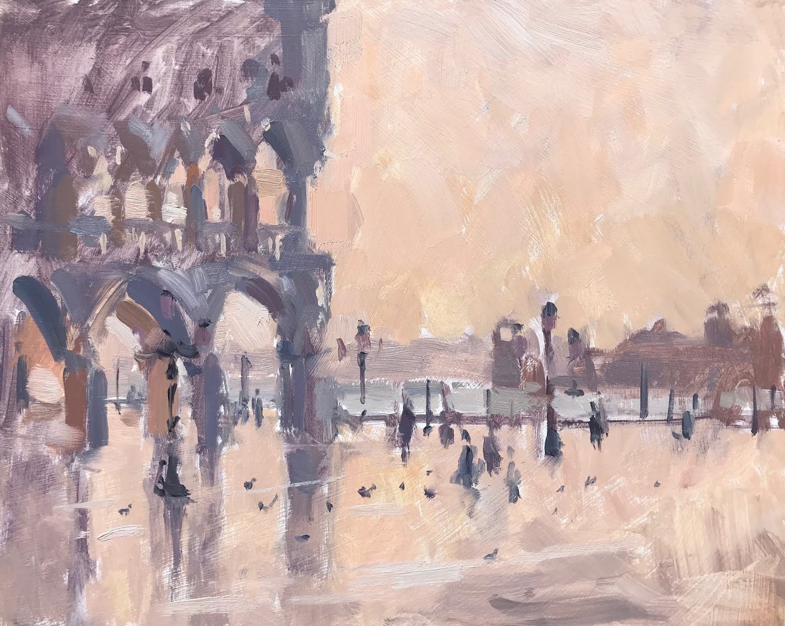 #371 ‘Painting St Marks Square, Venice’ no.2 by Clare Bowen | Sep 8, 2018 | Italy, St Marks Square, The Grand Canal, Venice The second quick painting I did in St Marks Square with wonderful apricot light.