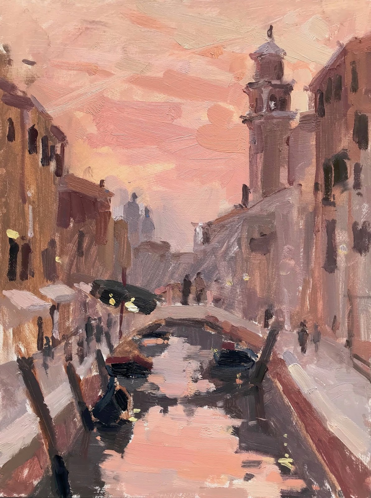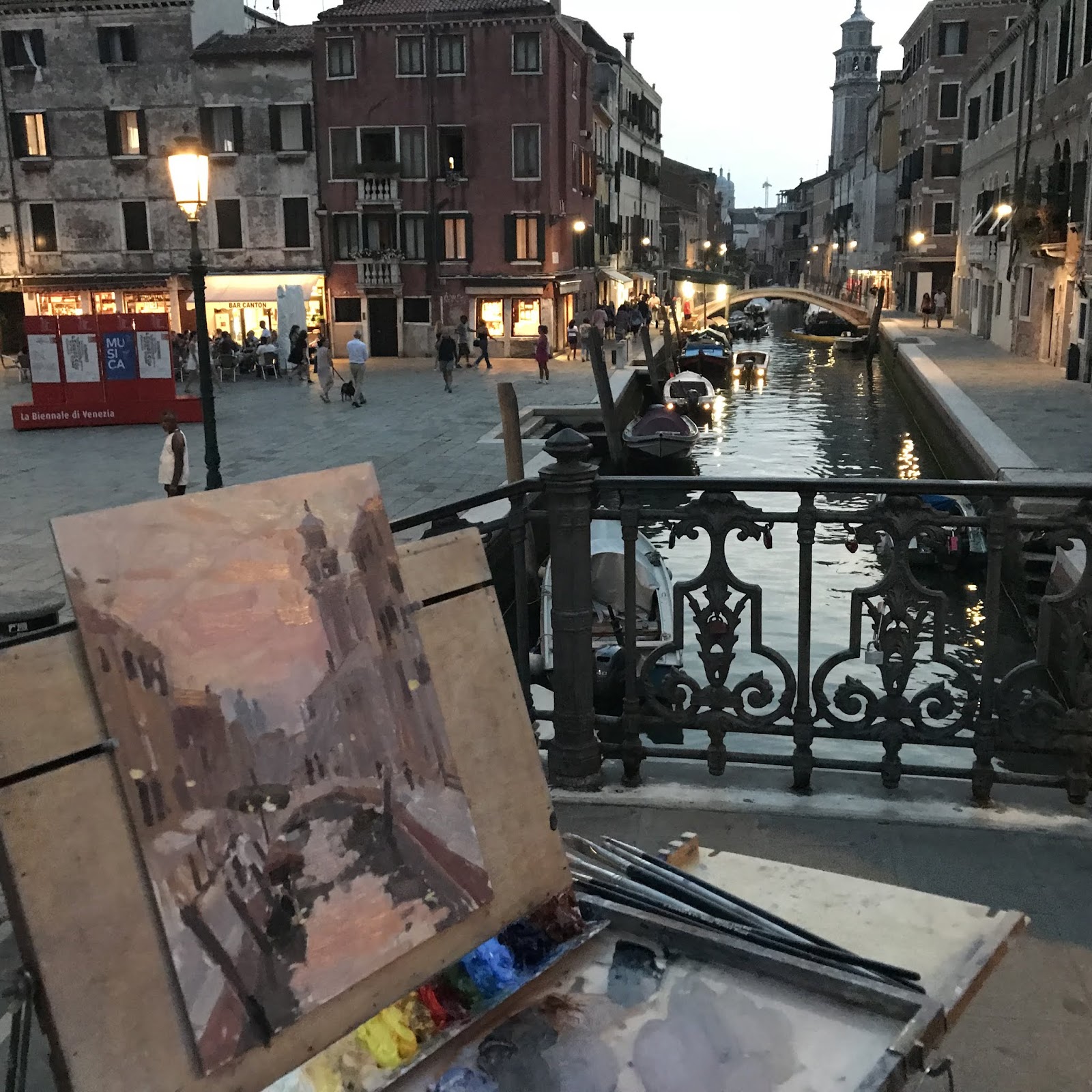 I stood on a small bridge thinking I’ll do it in the evening when its not so busy. But I didn’t know it was the first night of the glass week, with much street celebrating and fizz popping! Quite a bustle and lots of people were stopping to chat and look at my painting. A tricky subject easier at dusk when the shapes are more merged together. Looking at big tonal areas instead of al the details!