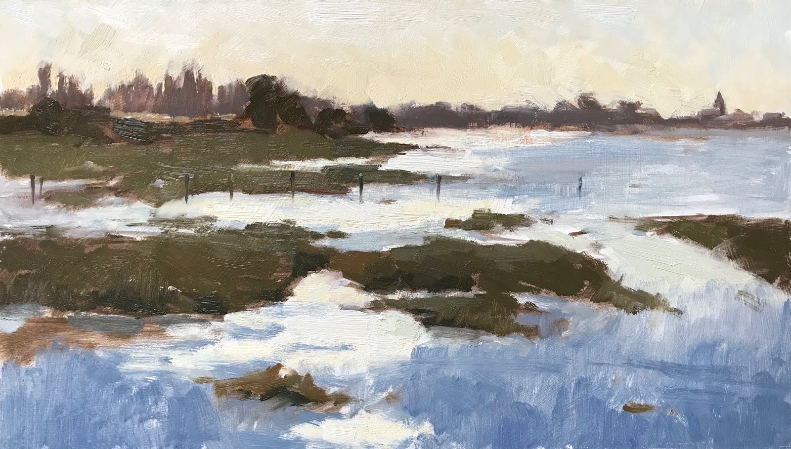 An oil sketch before the tide swallowed the grasses up. I was pleased the sun direction was directly in front of me so great light on the water.