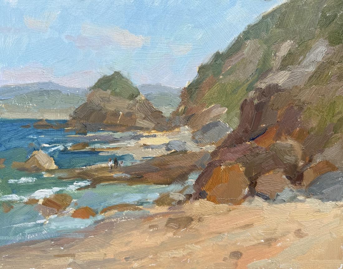 Polkerris beach near Fowey, with beautiful morning light on the cliffs and rocks on a receding tide.