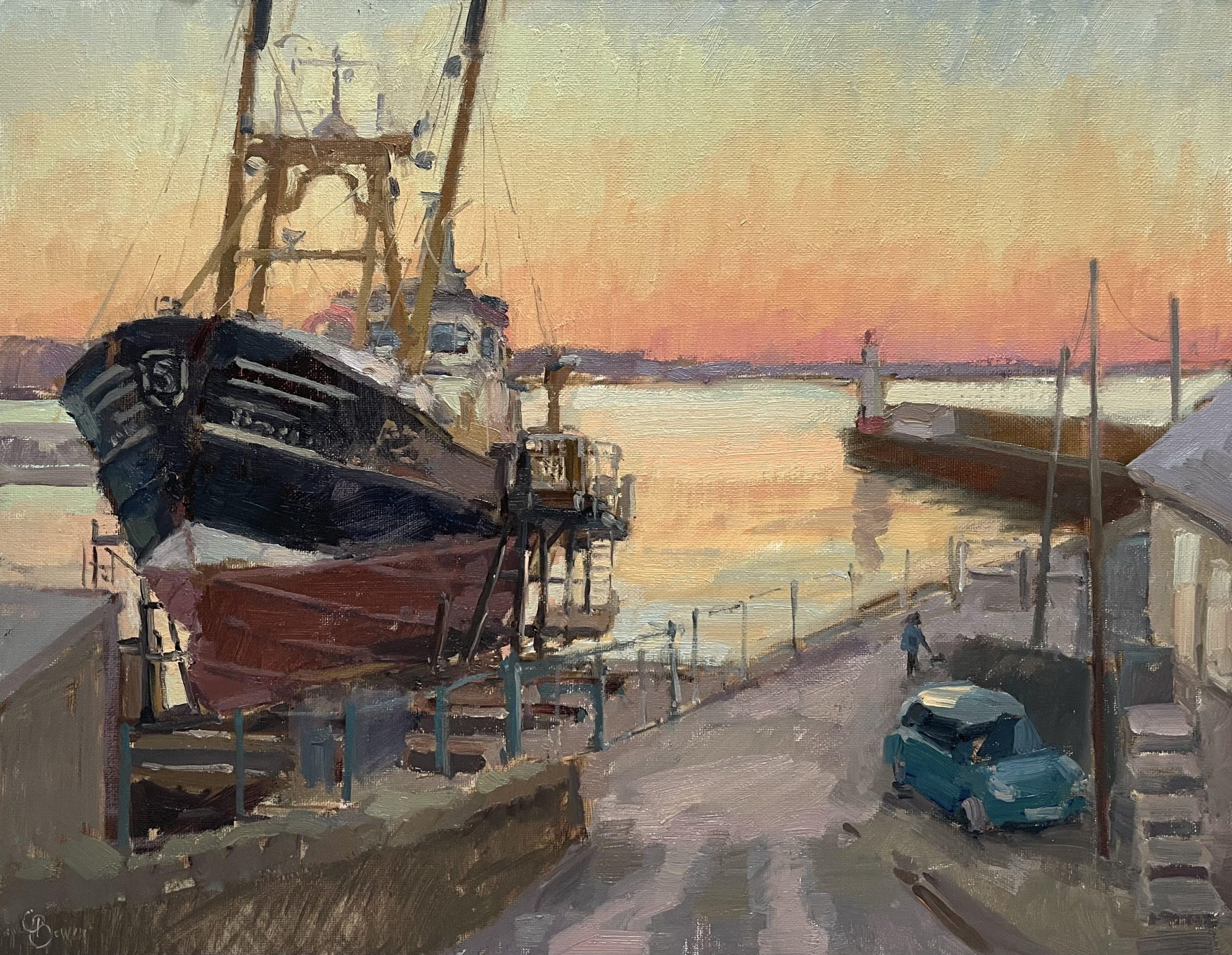 Iridescent light, at sunset. Newlyn harbour with the lighthouse and St Micheal’s Mount in the distance. Dry Docks with a large fishing boat having work done.