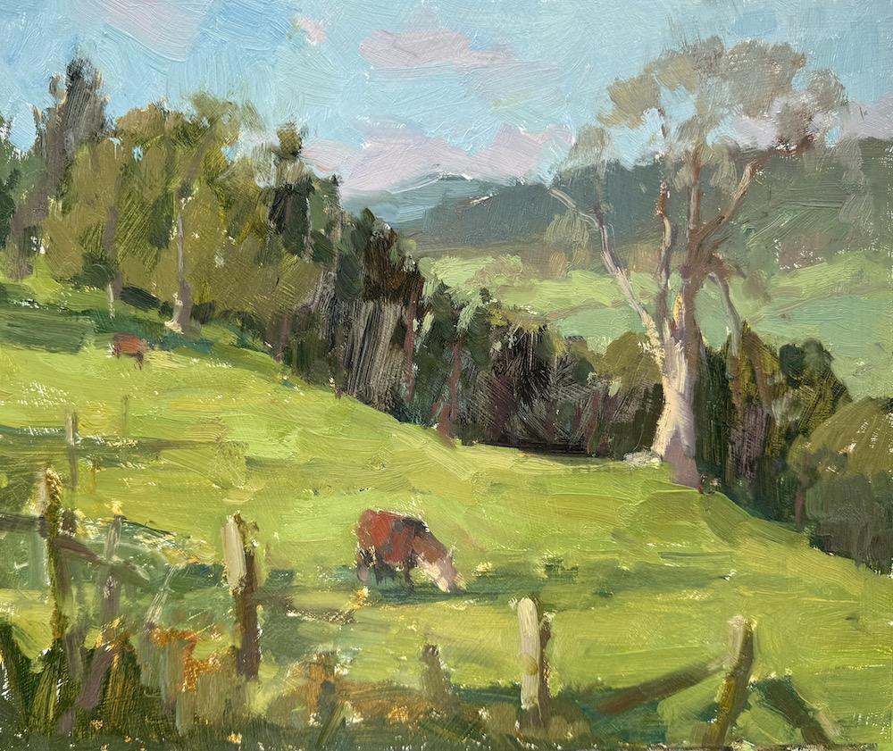 Two huge bulls friends in a field – they lick each other and sleep next together, wonderful to see them as I painted this. They had to be included!