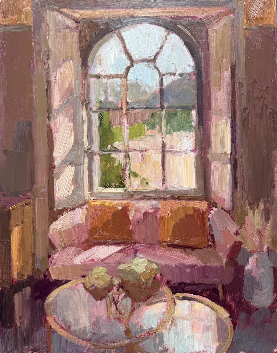 Morning light streaming through the beautiful arched window. Sumptuous pinks and golds with reflected light in the rounded table.