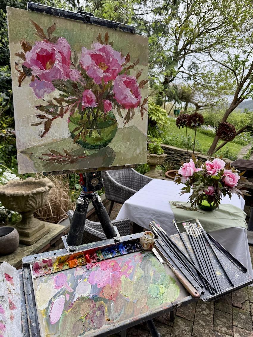 First Peonies of the season, wonderful blousy and huge heads, painted in an outside setting.