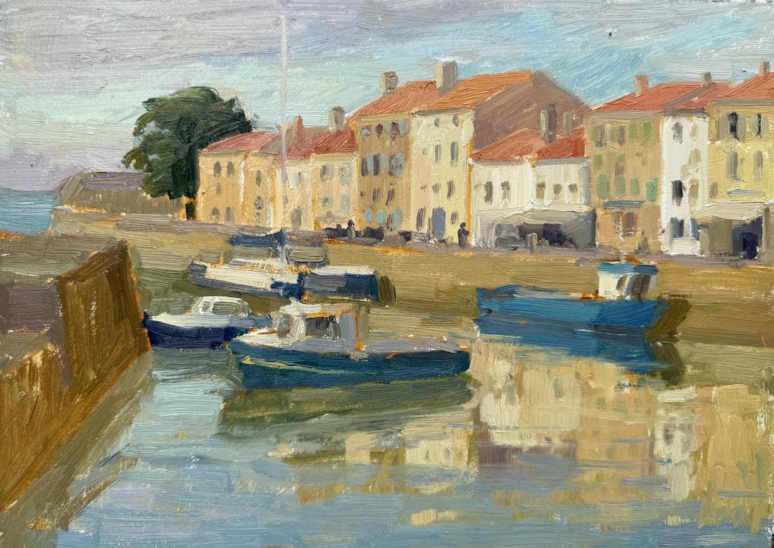 Evening golden hour light on the houses and cafe and reflected into the water.